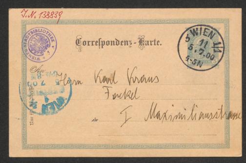 Loos, Adolf: Postkarte an Lina Loos. Wien, 5.7.1900