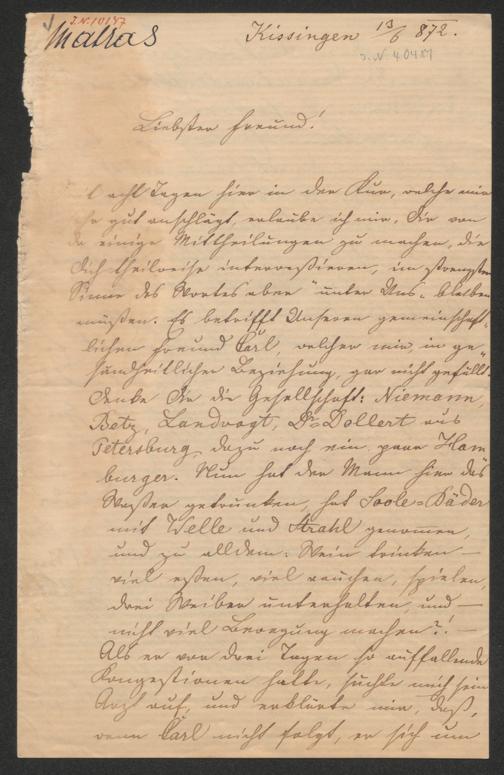 Matras, Josef: Brief an Leopold Rosner. Kissingen, 13.6.1872