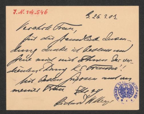 Meyer, Richard M.: Billett an Ottilie Franzos. Berlin, 26.3.1907