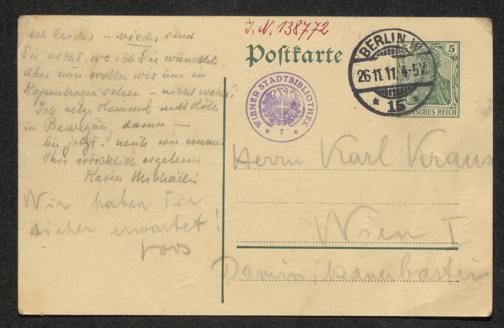 Michaëlis, Karin: Postkarte an Karl Kraus. Berlin, 26.11.1911