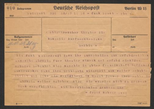 Molnár, Ferenc: Telegramm an Otto Tressler. Budapest, 11.12.1928