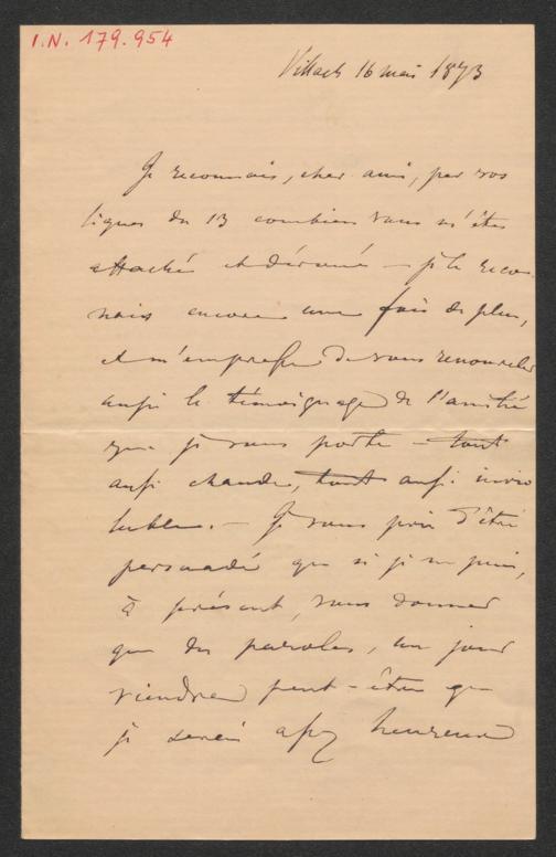 Mortier de Fontaine, Henri Louis Stanislaus: Brief an Wilhelm Kienzl. Villach, 16.5.1873. Wienbibliothek im Rathaus, H.I.N.-179954, https://resolver.obvsg.at/urn:nbn:at:AT-WBR-1225364 / Public Domain Mark 1.0