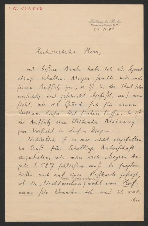 Müller, Hans von: Brief an August Sauer. Berlin, 23.11.1903