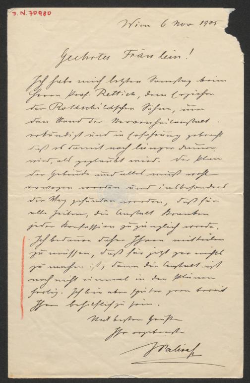 Palisa, Johann: Brief an Auguste Fickert. Wien, 6.11.1905