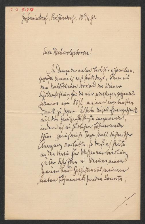 Peter, Johann: Brief an Ludwig August Frankl von Hochwart. Groß-Meiseldorf, 6.12.1891. Wienbibliothek im Rathaus, H.I.N.-73758, https://resolver.obvsg.at/urn:nbn:at:AT-WBR-1325333 / Public Domain Mark 1.0