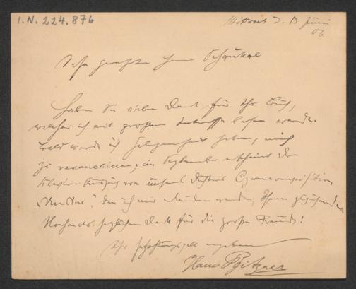 Pfitzner, Hans: Briefbillett an Richard von Schaukal. o.O., 13.6.1906