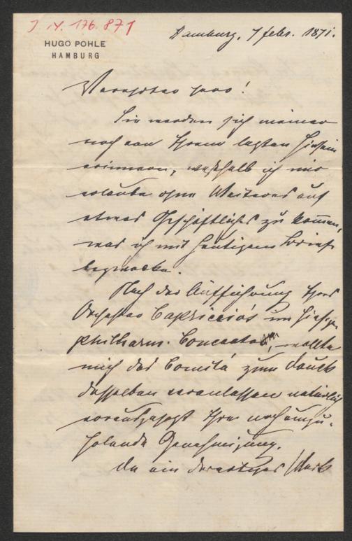 Pohle, Hugo: Brief an Hermann Graedener. Hamburg, 1.2.1871
