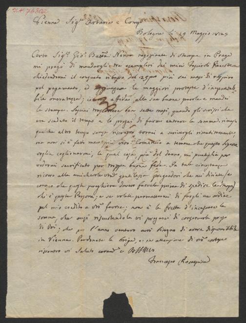 Rosaspina, Francesco: Brief an Artaria und Compagnie. Bologna, 19.5.1825