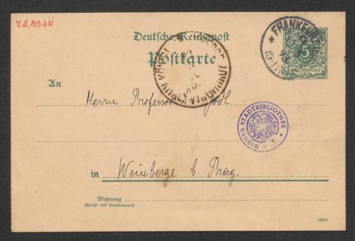 Saenger, Carl: Postkarte an Friedrich Jodl. Frankfurt, Main, 19.5.1893