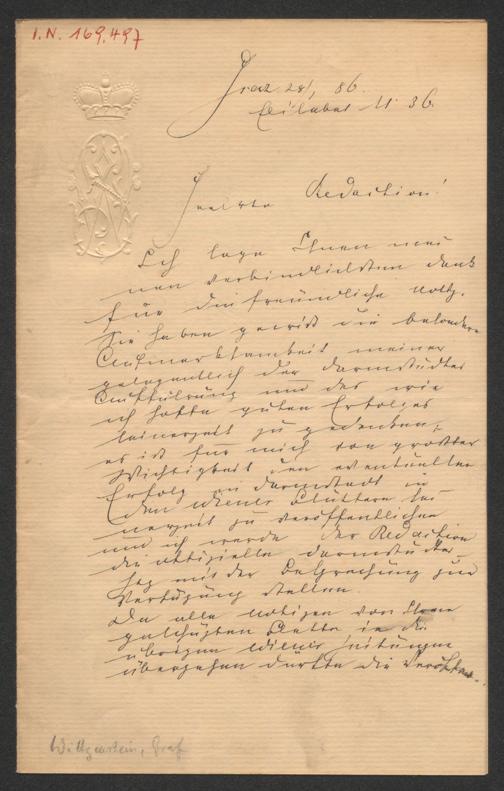 Sayn-Wittgenstein-Berleburg, Friedrich Ernst zu: Brief an Franz Zweybrück. Graz, 28.1.1886. Wienbibliothek im Rathaus, H.I.N.-169497, https://resolver.obvsg.at/urn:nbn:at:AT-WBR-1517423 / Public Domain Mark 1.0