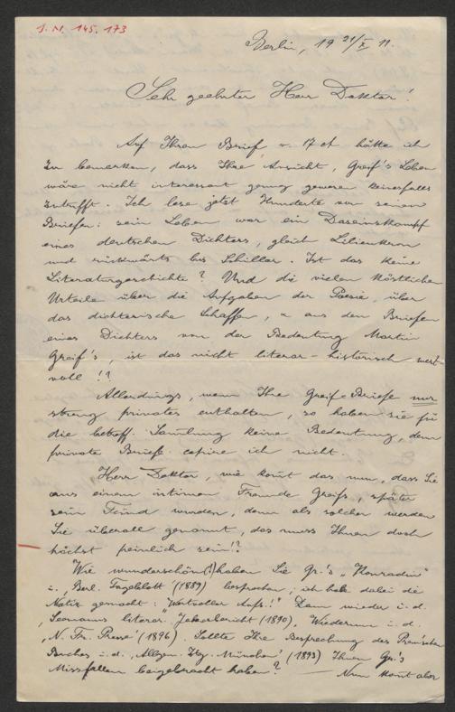 Schindler, Wladimir: Brief an Moritz Necker. Berlin, 21.10.1911