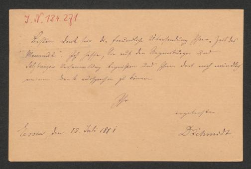 Schmidt, Emil: Postkarte an Matthäus Much. Essen, 15.7.1881