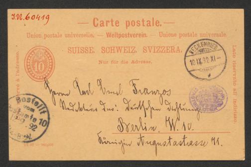 Schumacher, Tony: Korrespondenzkarte an Karl Emil Franzos. Beckenried, 10.9.1892