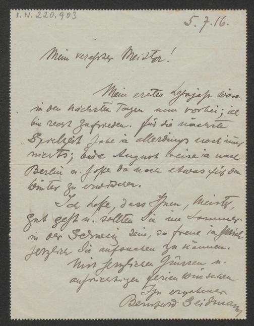 Seidmann, Bernhard: Kartenbrief an Franz Schalk. Karlsruhe, 5.7.1916