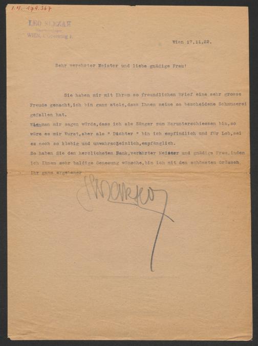 Slezak, Leo: Brief an Wilhelm Kienzl. Wien, 17.11.1922