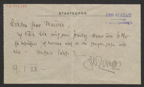 Slezak, Leo: Mitteilung an Gustav Mäurer. Wien, 9.1.1923