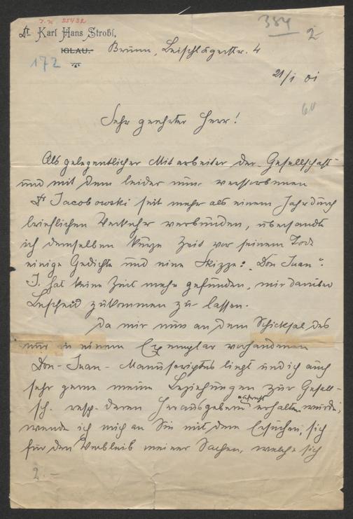 Strobl, Karl Hans: Brief an Unbekannt. Brünn, 21.1.1901
