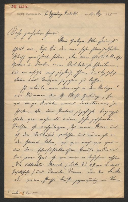 Suttner, Bertha von: Brief an Unbekannt. Harmannsdorf, 14.12.1885