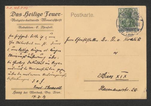 Thrasolt, Ernst: Postkarte an Richard von Kralik. Haag bei Marbach, 14.8.1913