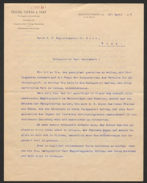 Friedr. Vieweg und Sohn: Brief an Matthäus Much. Braunschweig, 16.4.1902