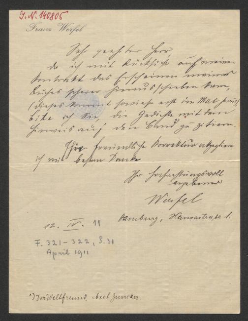 Werfel, Franz: Brief an Karl Kraus. o.O., 12.4.1911