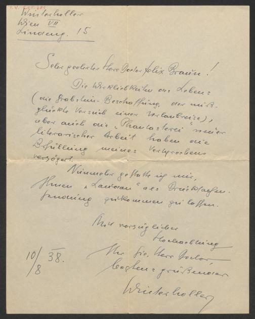 Winterholler, Friedrich: Brief an Felix Braun. Wien, 10.8.1938
