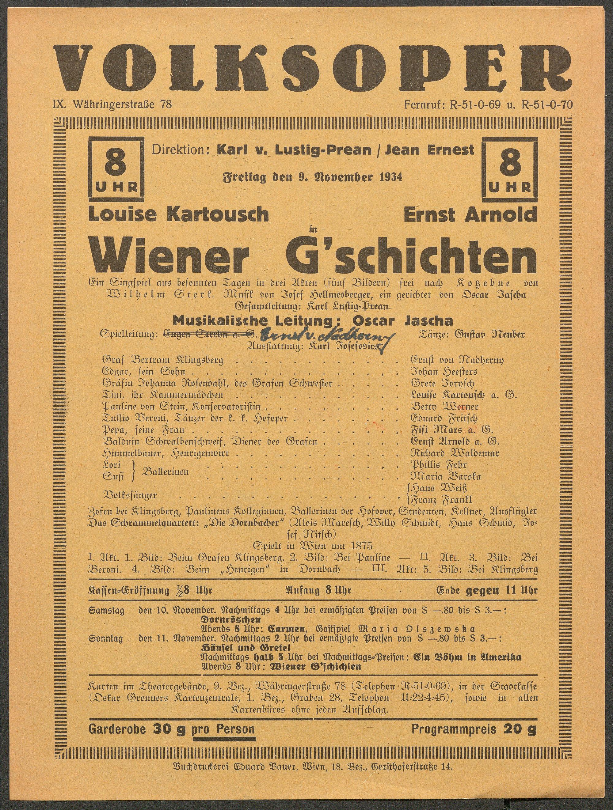 Wiener G'schichten : Ein Singspiel aus besonnten Tagen in drei Akten (fünf Bildern) frei nach Kotzebue