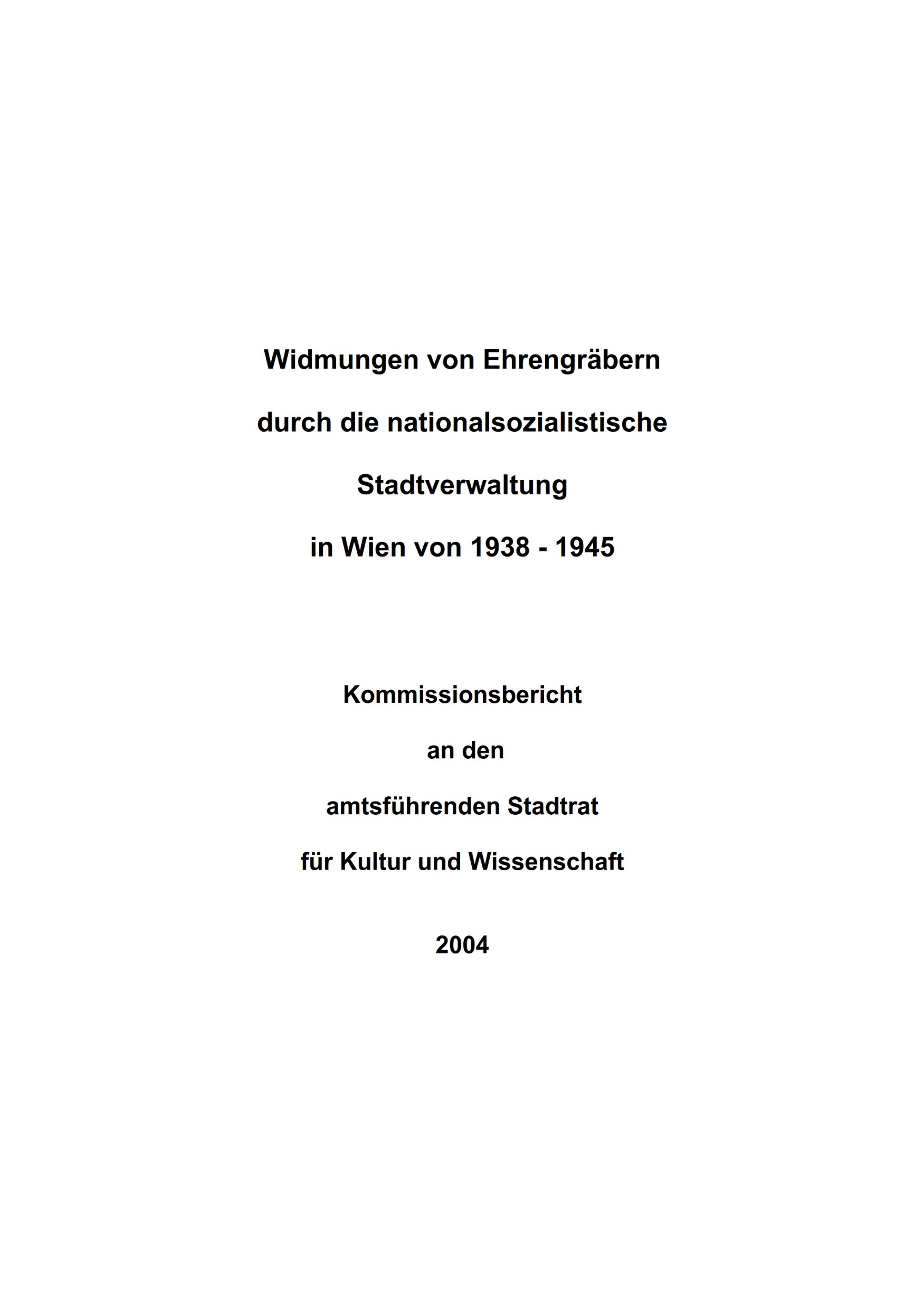 Widmungen von Ehrengräbern durch die nationalsozialistische Stadtverwaltung in Wien von 1938-1945 : Kommissionsbericht an den amtsführenden Stadtrat für Kultur und Wissenschaft 2004