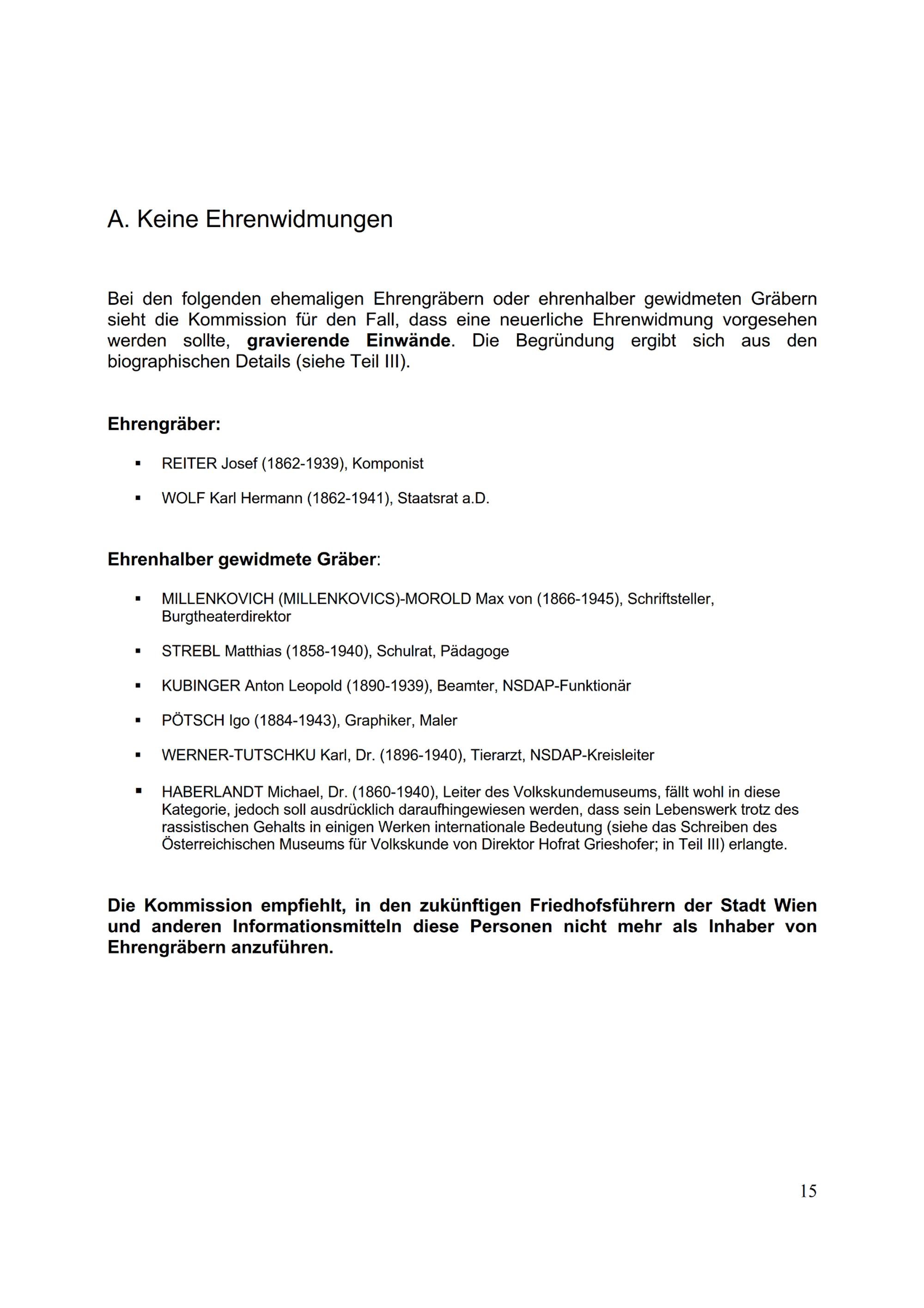 Widmungen von Ehrengräbern durch die nationalsozialistische Stadtverwaltung in Wien von 1938-1945 : Kommissionsbericht an den amtsführenden Stadtrat für Kultur und Wissenschaft 2004