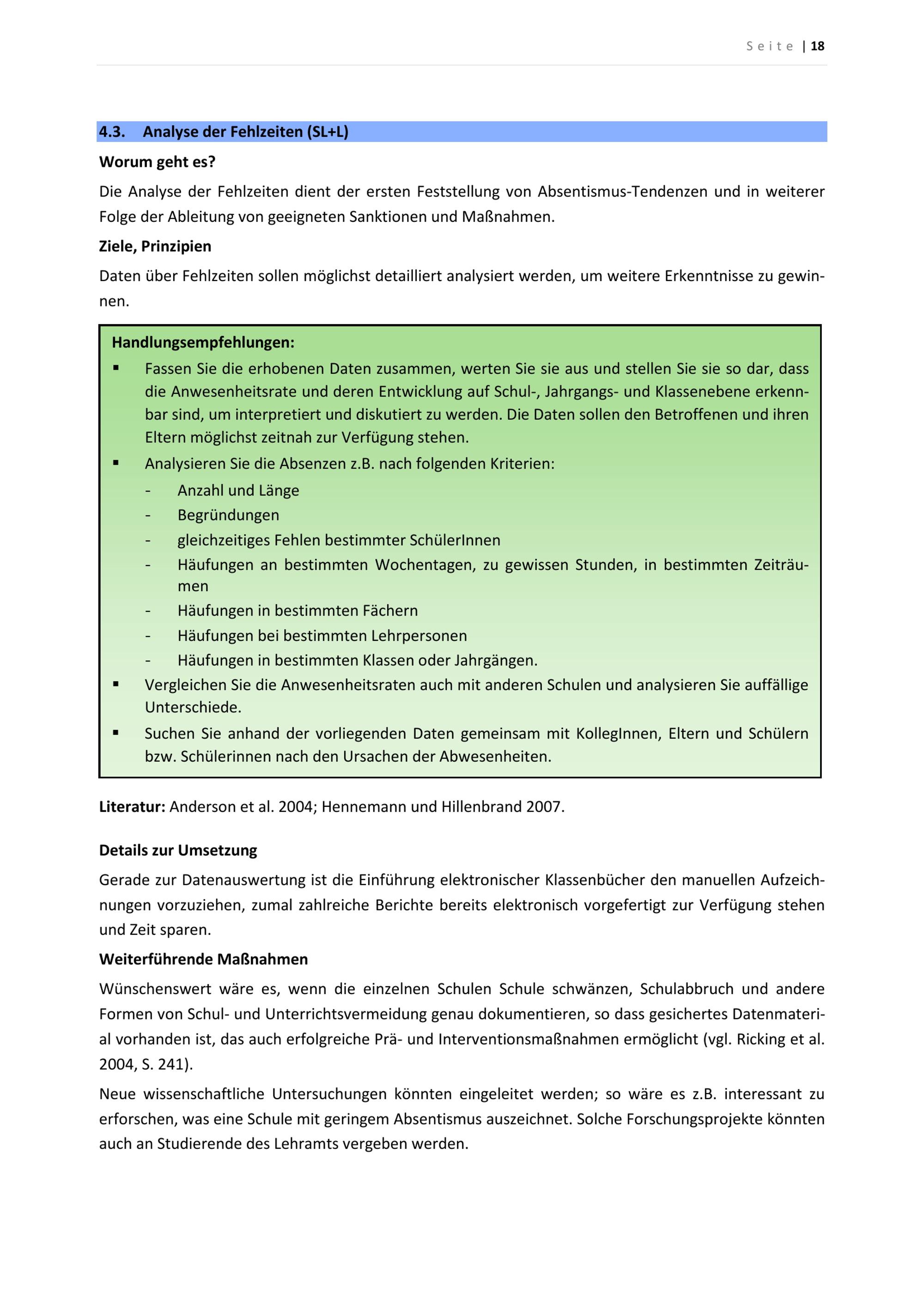 Handlungsempfehlungen für Lehrende, Schulleitung und Eltern zur erfolgreichen Prävention von Schulabsentismus und Schulabbruch : Aufbruch zu einer neuen Schulkultur : Endbericht / durchgeführt im Auftrag der Magistratsabteilung 23 der Stadt Wien ; Wissenschaftliche Leitung: Ao. Univ.-Prof. Dr. Erna Nairz-Wirth ; Bearbeitung: Univ.-Prof. Dr. Klaus Feldmann, Mag. Barbara Diexer, MSc ; wissenschaftliche Unterstützung: Dr. Elisabeth Wendebourg, Mag. Marie Gitschthaler ; Medieninhaber (Verleger), Herausgeber und Hersteller: Abteilung für Bildungswissenschaft, Wirtschaftsuniversität Wien