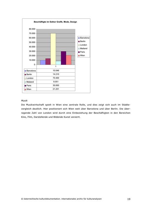 Die wirtschaftliche Bedeutung von Kultur und Creative Industries : Wien im Städtevergleich mit Barcelona, Berlin, London, Mailand und Paris / im Auftrag von: Stadt Wien, Magistratsabteilung 27 EU-Strategie und Wirtschaftsentwicklung ; erstellt von: Österreichische Kulturdokumentation | Internationales Archiv für Kulturanalysen ; Eva Häfele, Andrea Lehner, Veronika Ratzenböck