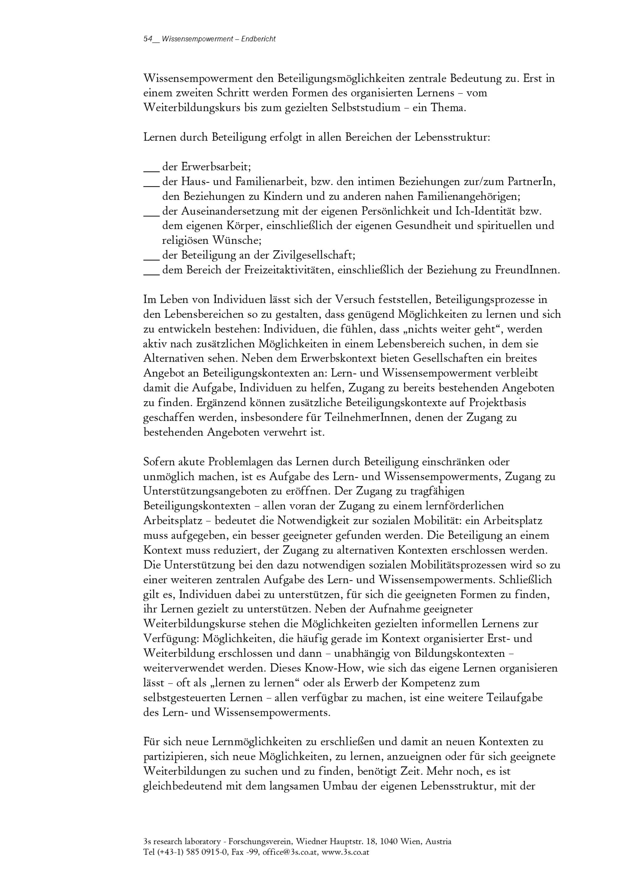 Wissensempowerment - Förderung der beruflichen Weiterbildungskompetenz und Weiterbildungsmotivation von bildungsfernen Personengruppen in Wien : Studie / AutorInnen: Mag. Viktor Fleischer (3s research laboratory), Mag. Günter Hefler (3s research laboratory, Donau-Universität Krems), DI Dr. Jörg Markowitsch (3s research laboratory, Donau-Universität Krems) ; unter Mitarbeit von: Mag.a Tanja Bacher (3s research laboratory), Ing. Martin Schrotter (3s research laboratory) ; im Auftrag der MA 27 (EU-Strategie und Wirtschaftsentwicklung) der Stadt Wien