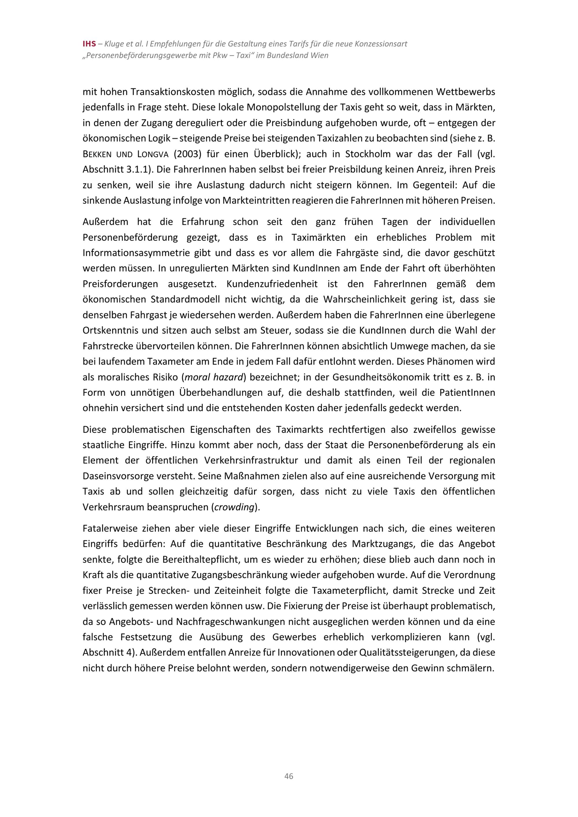 Empfehlungen für die Gestaltung eines Tarifs für die neue Konzessionsart „Personenbeförderungsgewerbe mit Pkw –Taxi“ im Bundesland Wien / Jan Kluge (IHS), Martin G. Kocher (IHS, Universität Wien), Wieland Müller (Universität Wien), Hannes Zenz (IHS) ; Studie im Auftrag der Magistratsabteilung 23 der Stadt Wien ; Institut für Höhere Studien – Institute for Advanced Studies (IHS)