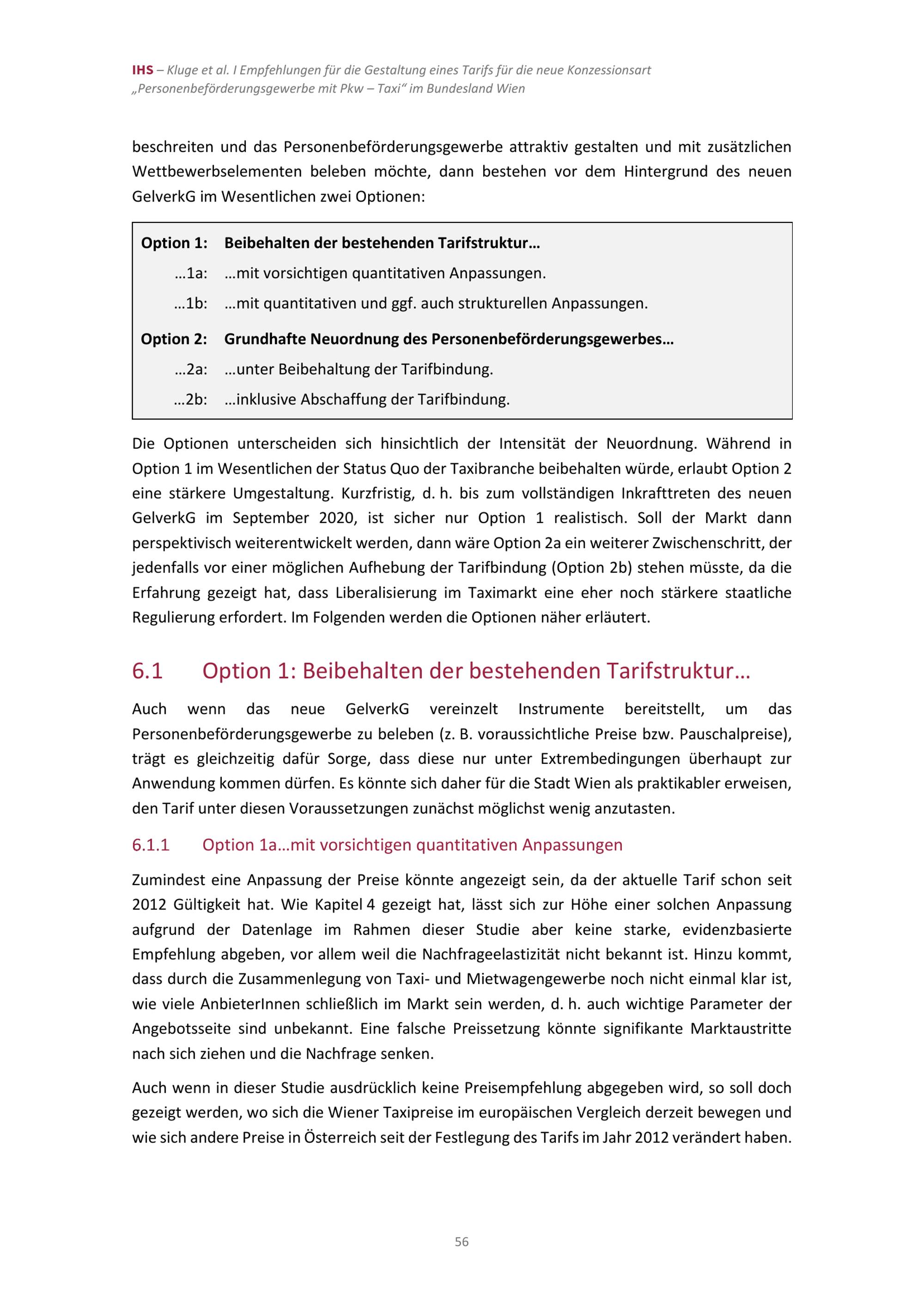 Empfehlungen für die Gestaltung eines Tarifs für die neue Konzessionsart „Personenbeförderungsgewerbe mit Pkw –Taxi“ im Bundesland Wien / Jan Kluge (IHS), Martin G. Kocher (IHS, Universität Wien), Wieland Müller (Universität Wien), Hannes Zenz (IHS) ; Studie im Auftrag der Magistratsabteilung 23 der Stadt Wien ; Institut für Höhere Studien – Institute for Advanced Studies (IHS)