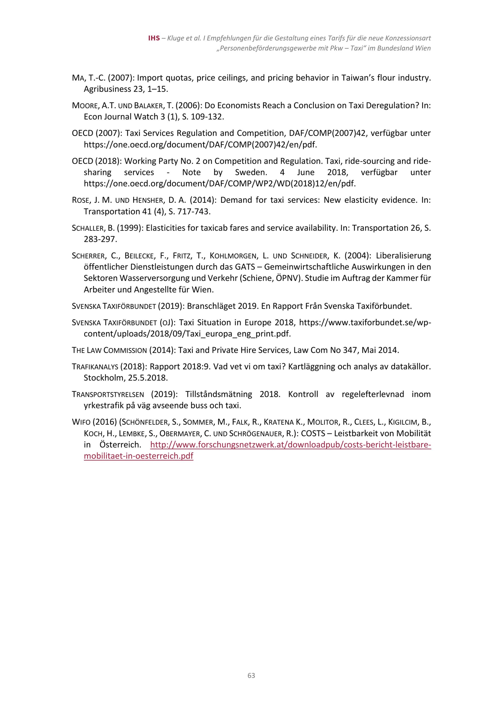 Empfehlungen für die Gestaltung eines Tarifs für die neue Konzessionsart „Personenbeförderungsgewerbe mit Pkw –Taxi“ im Bundesland Wien / Jan Kluge (IHS), Martin G. Kocher (IHS, Universität Wien), Wieland Müller (Universität Wien), Hannes Zenz (IHS) ; Studie im Auftrag der Magistratsabteilung 23 der Stadt Wien ; Institut für Höhere Studien – Institute for Advanced Studies (IHS)
