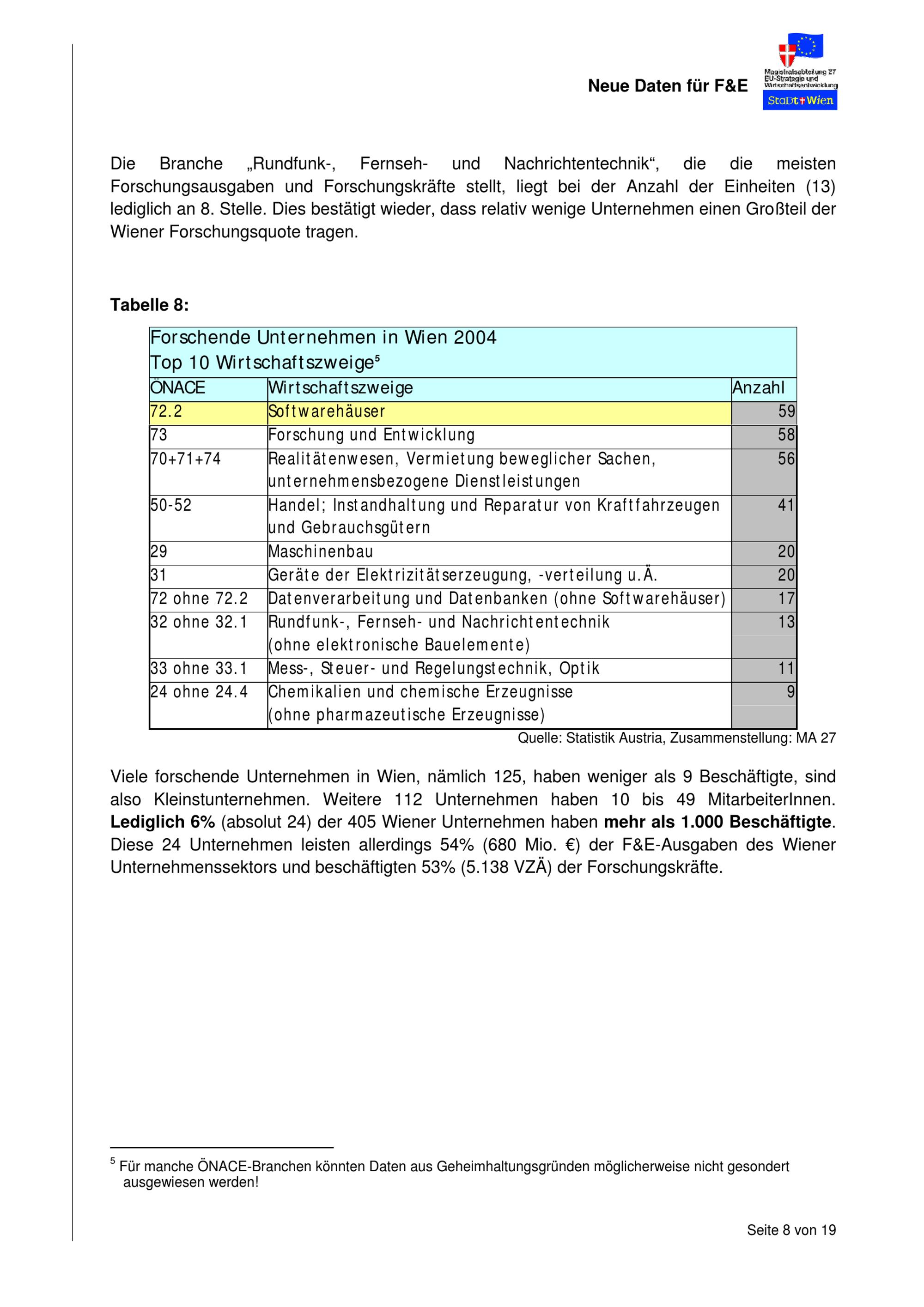 "Wien: Forschung im Unternehmenssektor" : F&E-Daten im Vergleich : Ergebnisse der Spezialauswertung der Statistik Austria für Wien 2004 / Mag.a Elisabet Unger ; Magistratsabteilung 27 - EU-Strategie und Wirtschaftsentwicklung Dezernat Arbeit, Wirtschaft, Technologie und Forschung