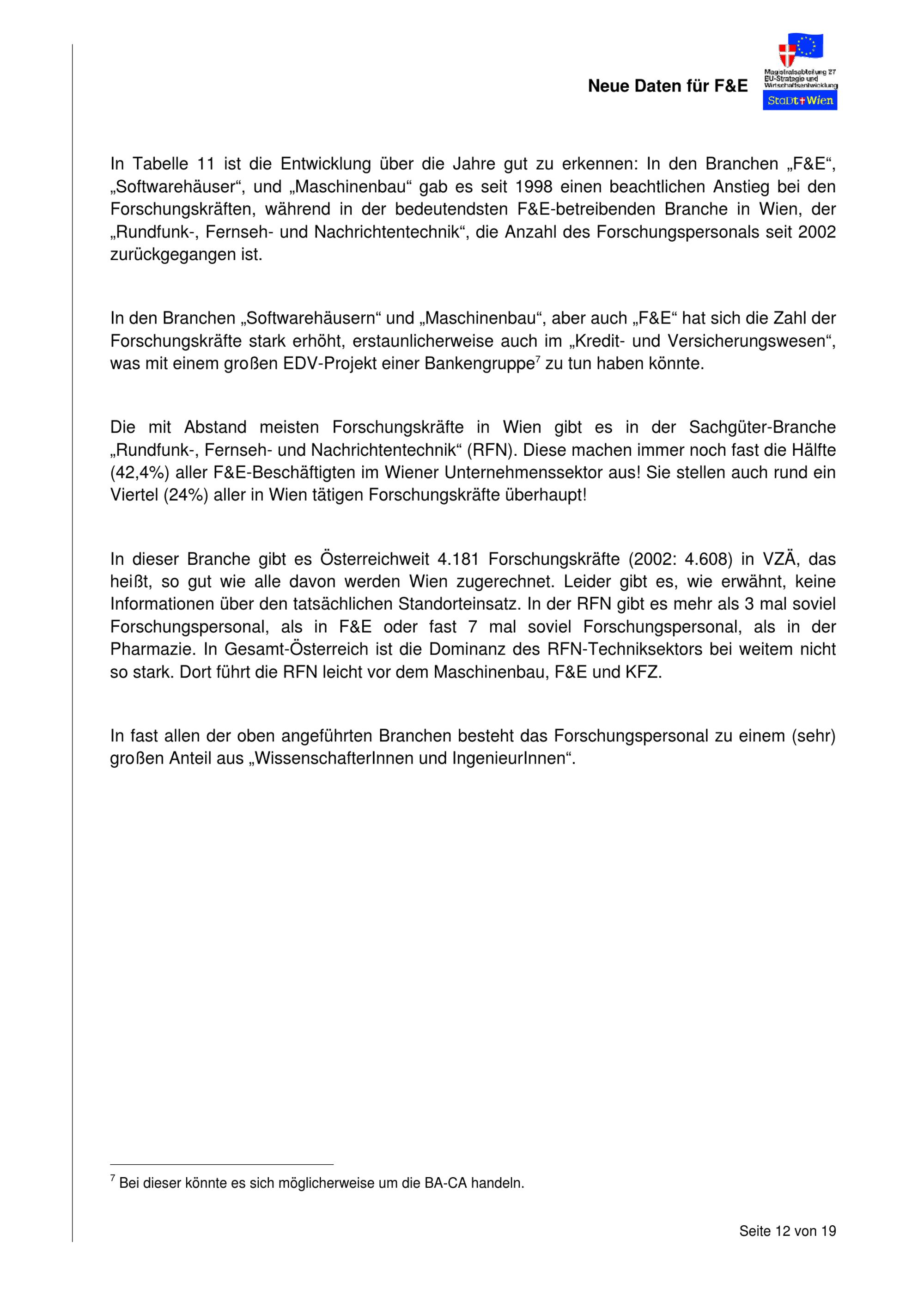 "Wien: Forschung im Unternehmenssektor" : F&E-Daten im Vergleich : Ergebnisse der Spezialauswertung der Statistik Austria für Wien 2004 / Mag.a Elisabet Unger ; Magistratsabteilung 27 - EU-Strategie und Wirtschaftsentwicklung Dezernat Arbeit, Wirtschaft, Technologie und Forschung