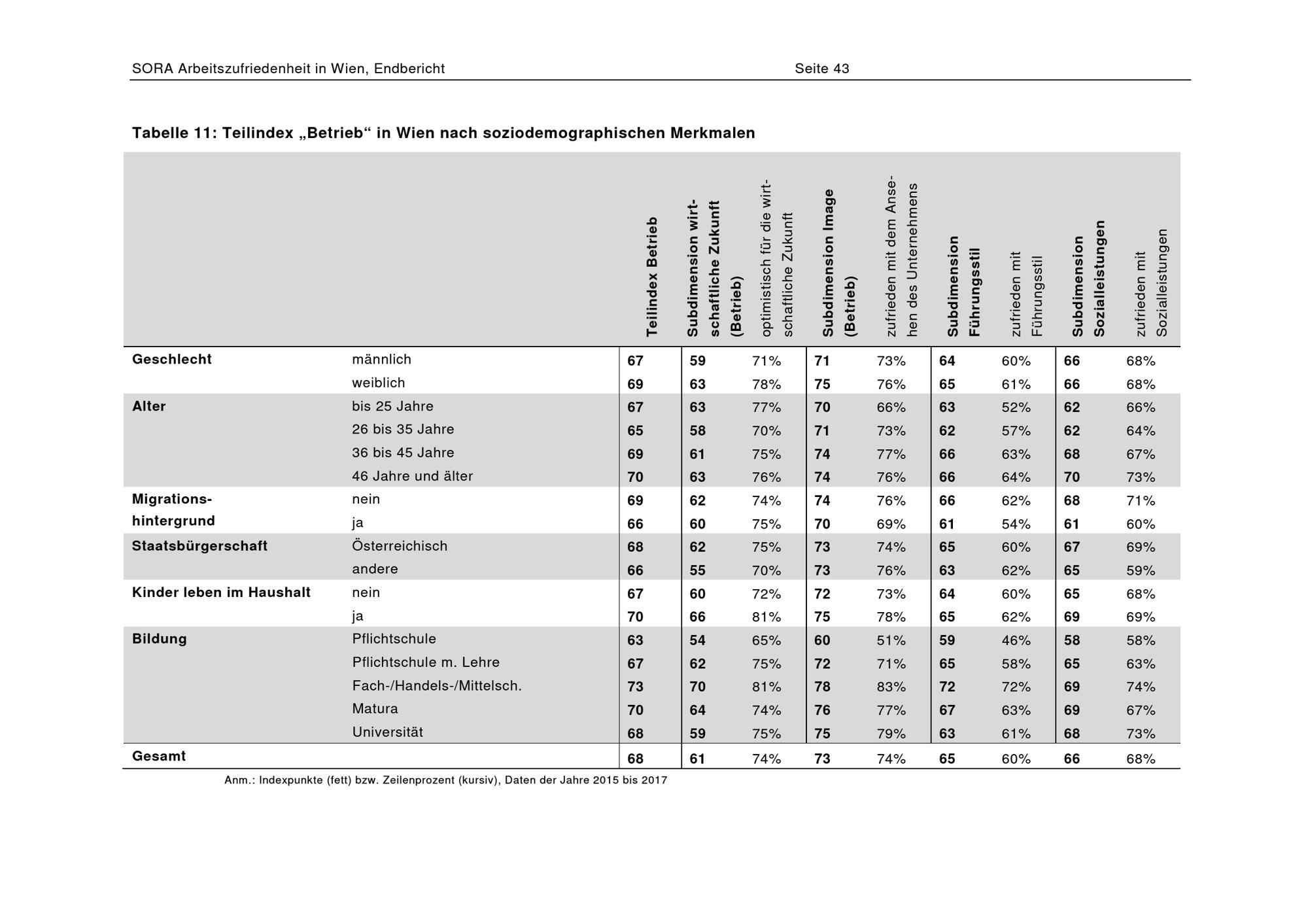 Arbeitszufriedenheit in Wien : Neuauswertung des Arbeitsklima Index: 2015 bis 2017 / Daniel Schönherr ; SORA ; MA 23 - Wirtschaft, Arbeit, Statistik