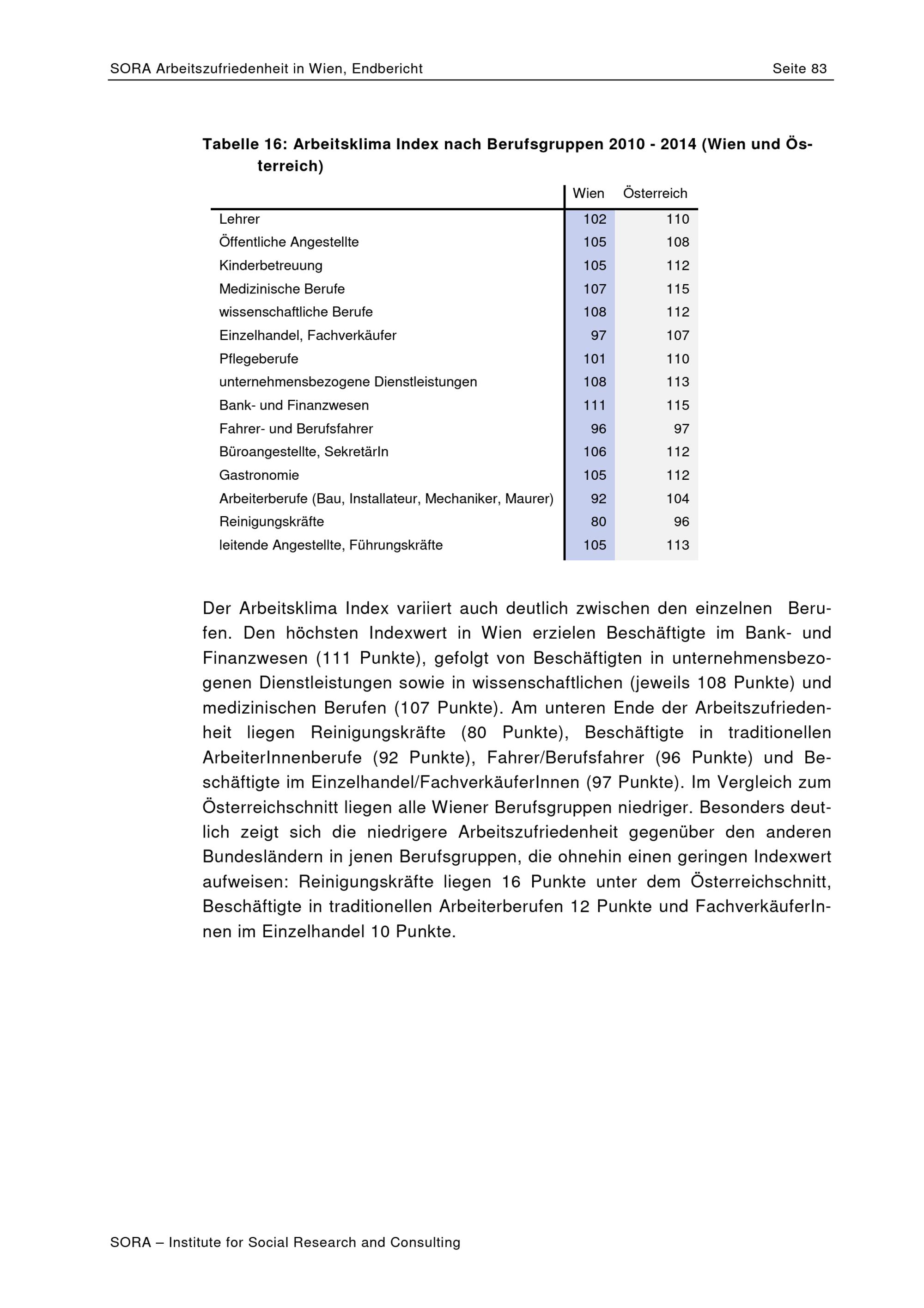 Arbeitszufriedenheit in Wien : Sonderauswertung des Arbeitsklima Index / Daniel Schönherr, Corinna Mayerl ; SORA ; MA 23 - Wirtschaft, Arbeit, Statistik