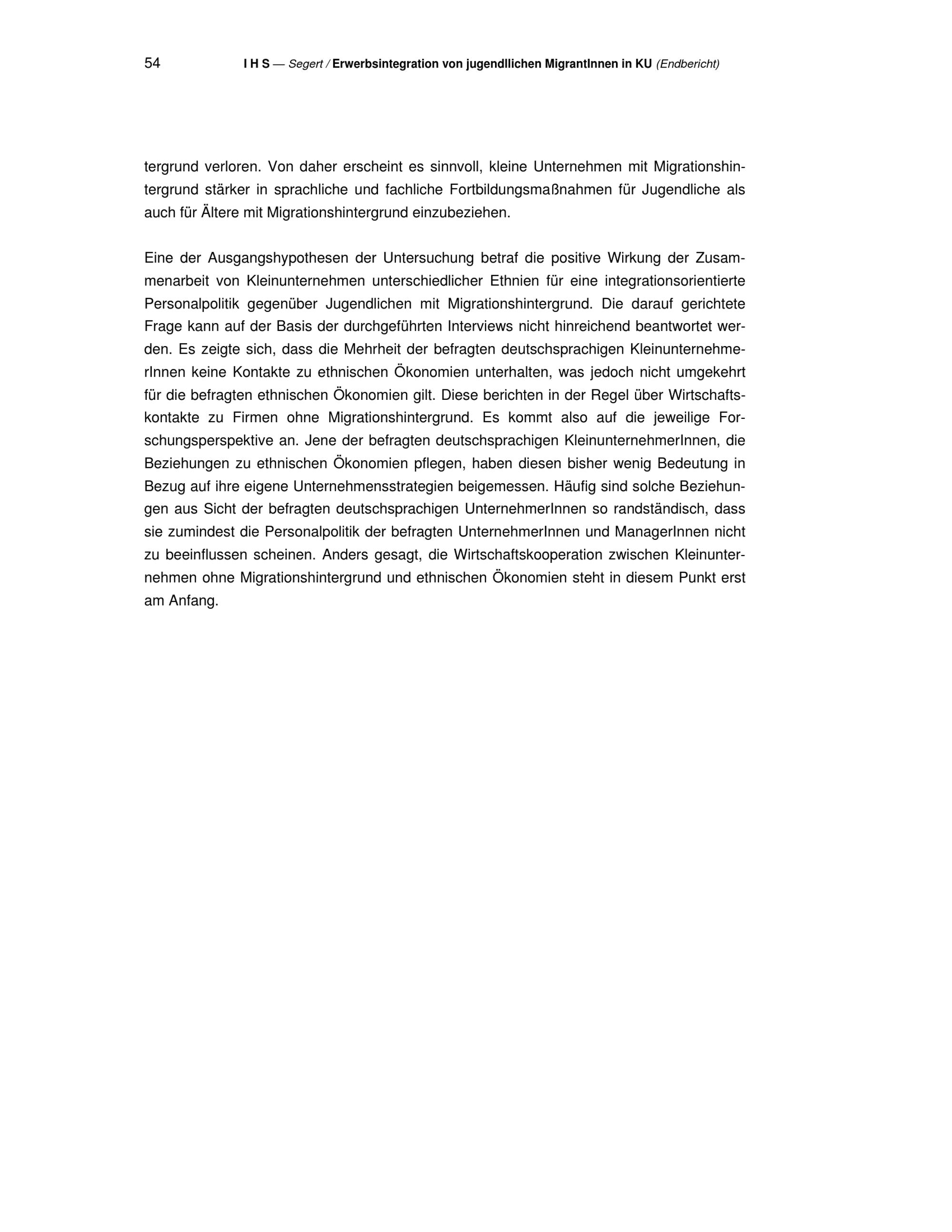 Kleinunternehmen und Jugendliche mit Migrationshintergrund - Chancen für die Erwerbsintegration : Endbericht / Astrid Segert ; Studie im Auftrag der Wirtschaftskammer Wien und der Stadt Wien MA 27