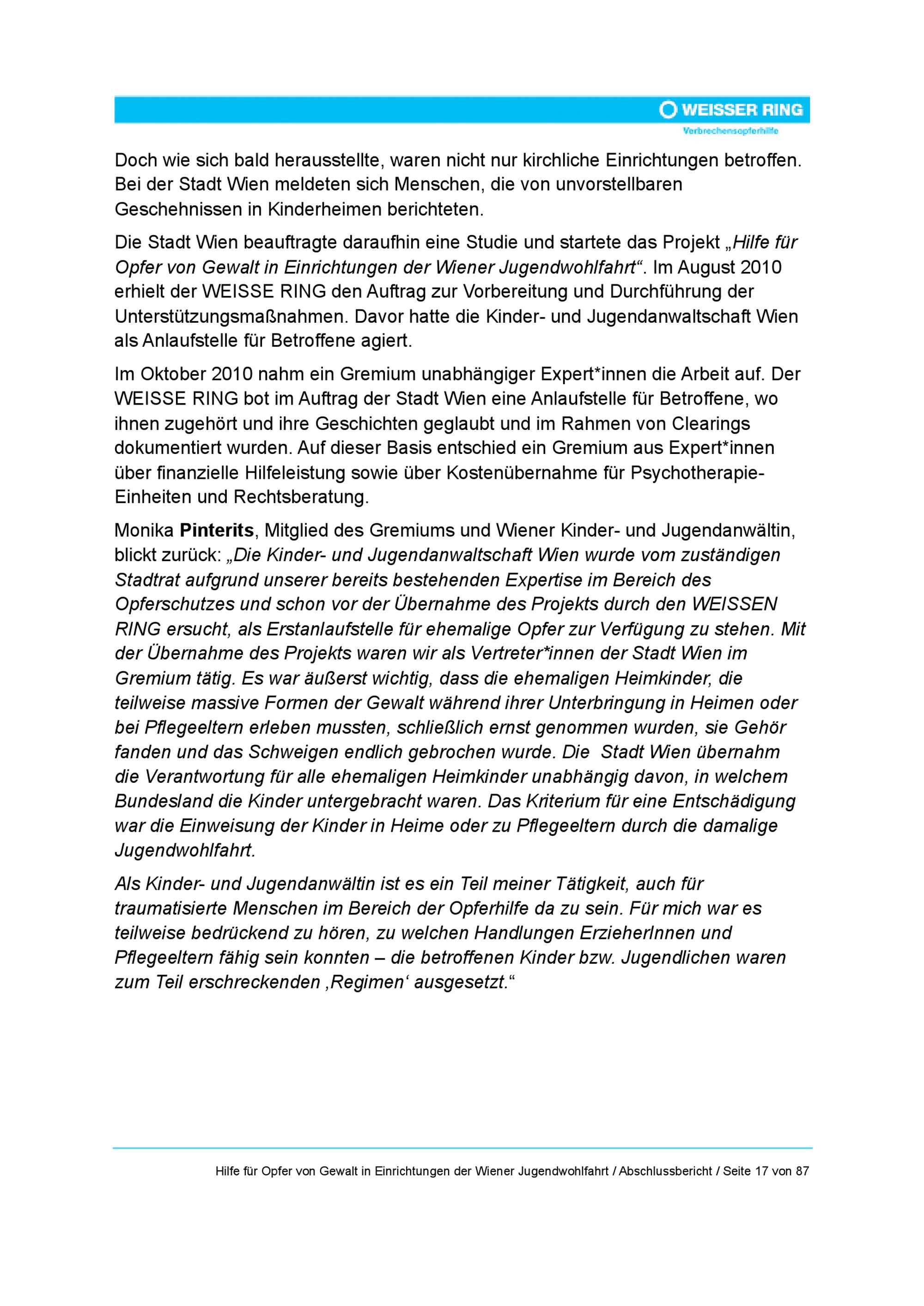Hilfe für Opfer von Gewalt in Einrichtungen der Wiener Jugendwohlfahrt : Projektzeitraum 2010-2019 : Abschlussbericht / Weisser Ring Verbrechensopferhilfe ; mit Beiträgen von Marianne Gammer, Udo Jesionek, Ralf Gößler [und 8 weiteren]