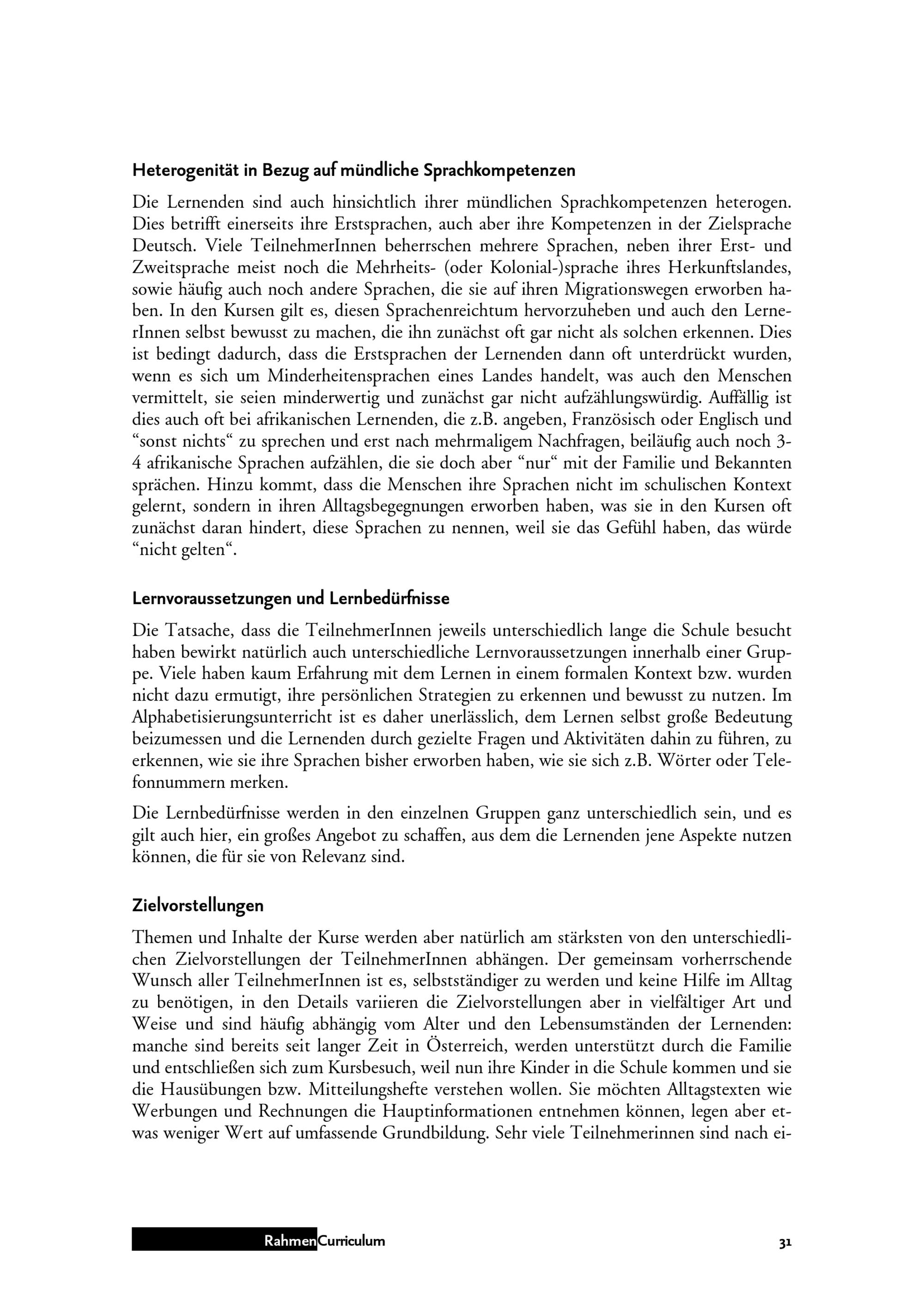 Rahmen Curriculum : Deutsch als Zweitsprache & Alphabetisierung / im Auftrag der MA 17 ; AutorInnen: Thomas Fritz (Institut für Weiterbildung des Verbands Wiener Volksbildung), Renate Faistauer (Universität Wien), Monika Ritter, Angelika Hrubesch (AlfaZentrum der Volkshochschule Ottakring)