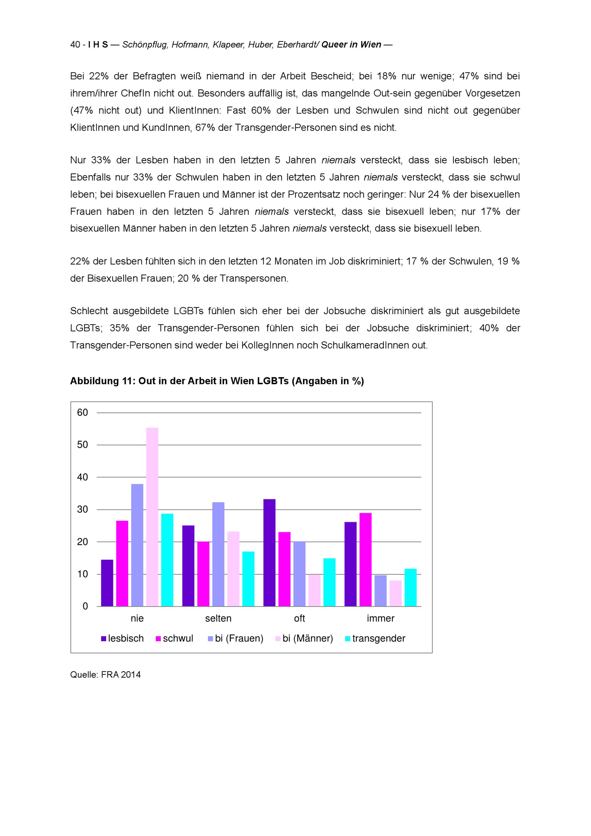" Queer in Wien" : Stadt Wien Studie zur Lebenssituation von Lesben, Schwulen, Bisexuellen, Transgender und Intersex Personen (LGBTIs) : Endbericht : Projektbericht = research report / Karin Schönpflug, Roswitha Hofmann, Christine M. Klapeer, Clemens Huber, Viktoria Eberhardt ; Studie im Auftrag der Wiener Antidiskriminierungsstelle für gleichgeschlechtliche und transgender Lebensweisen