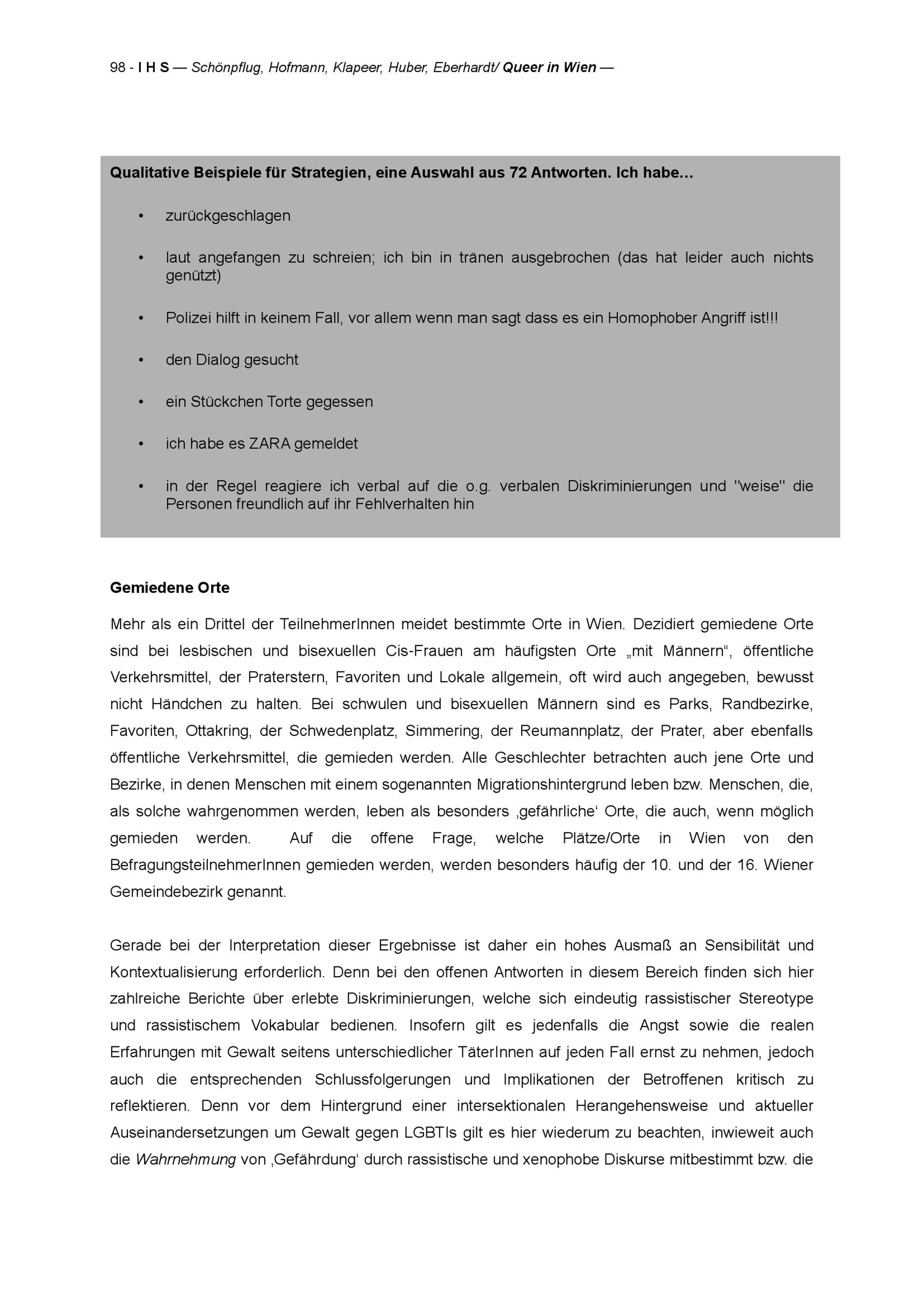 " Queer in Wien" : Stadt Wien Studie zur Lebenssituation von Lesben, Schwulen, Bisexuellen, Transgender und Intersex Personen (LGBTIs) : Endbericht : Projektbericht = research report / Karin Schönpflug, Roswitha Hofmann, Christine M. Klapeer, Clemens Huber, Viktoria Eberhardt ; Studie im Auftrag der Wiener Antidiskriminierungsstelle für gleichgeschlechtliche und transgender Lebensweisen