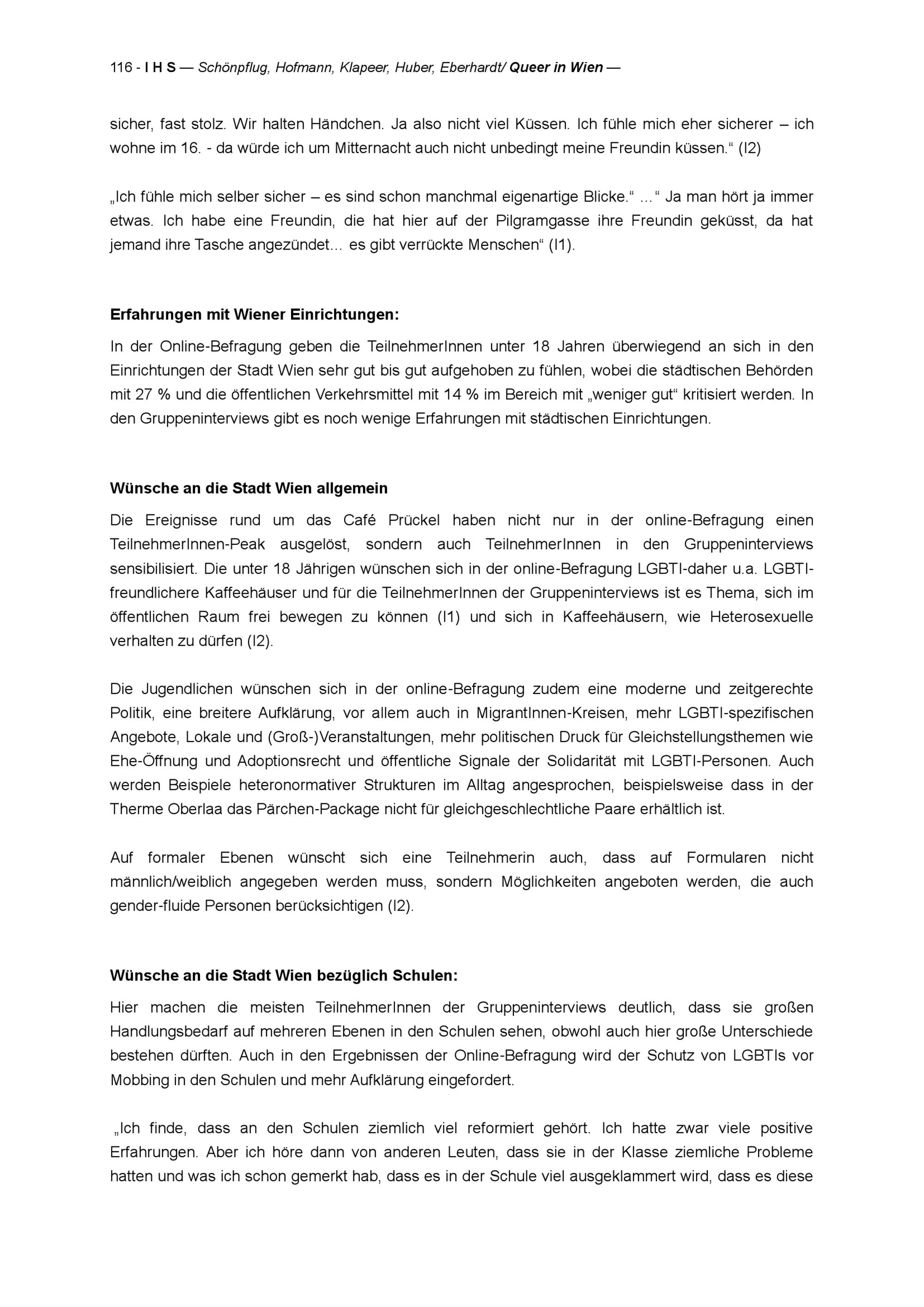 " Queer in Wien" : Stadt Wien Studie zur Lebenssituation von Lesben, Schwulen, Bisexuellen, Transgender und Intersex Personen (LGBTIs) : Endbericht : Projektbericht = research report / Karin Schönpflug, Roswitha Hofmann, Christine M. Klapeer, Clemens Huber, Viktoria Eberhardt ; Studie im Auftrag der Wiener Antidiskriminierungsstelle für gleichgeschlechtliche und transgender Lebensweisen