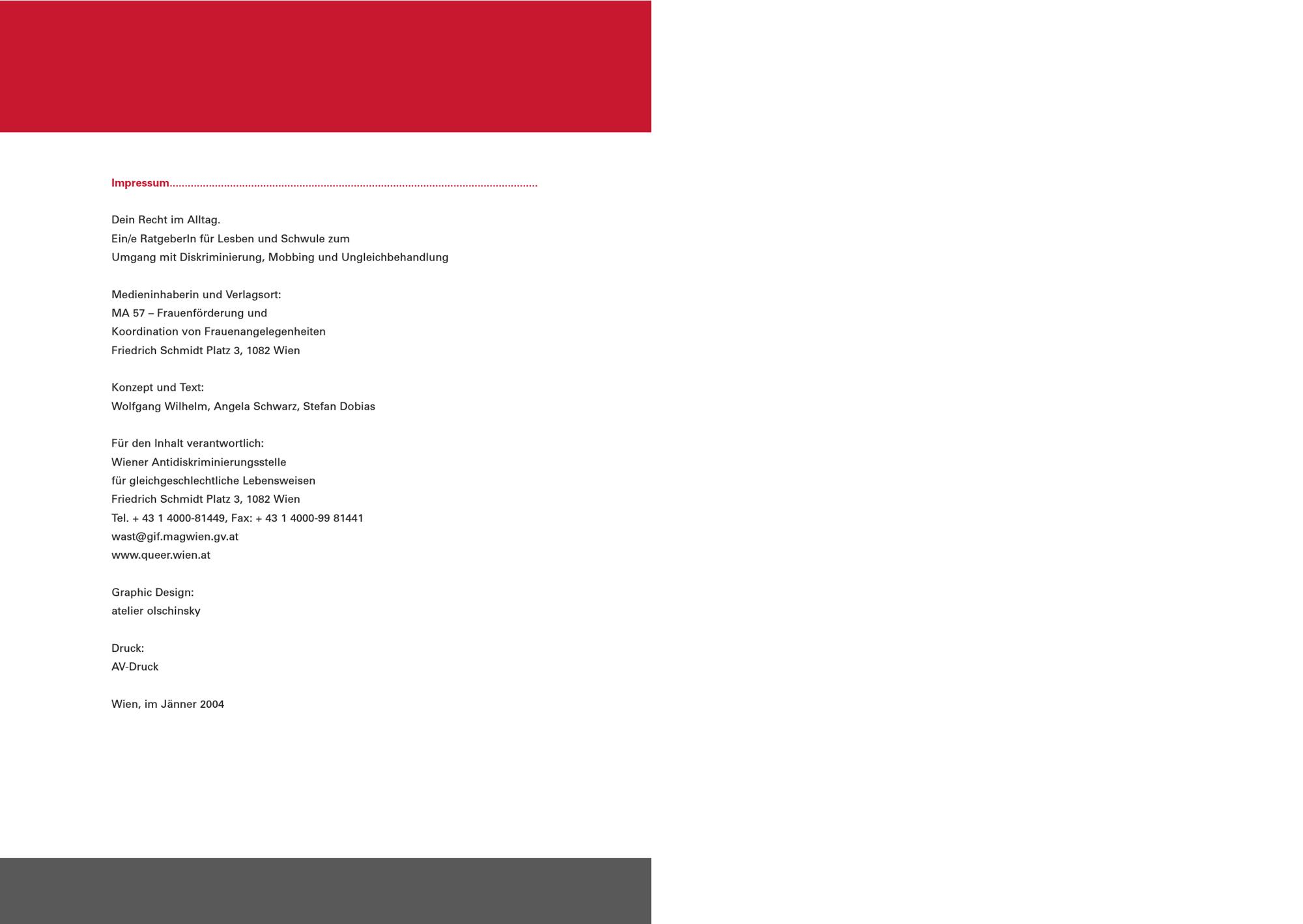 Dein Recht im Alltag : ein/e RatgeberIn für Lesben und Schwule zum Umgang mit Diskriminierung, Mobbing und Ungleichbehandlung / Konzept und Text: Wolfgang Wilhelm, Angela Schwarz, Stefan Dobias ; Wiener Antidiskriminierungsstelle für gleichgeschlechtliche Lebensweisen