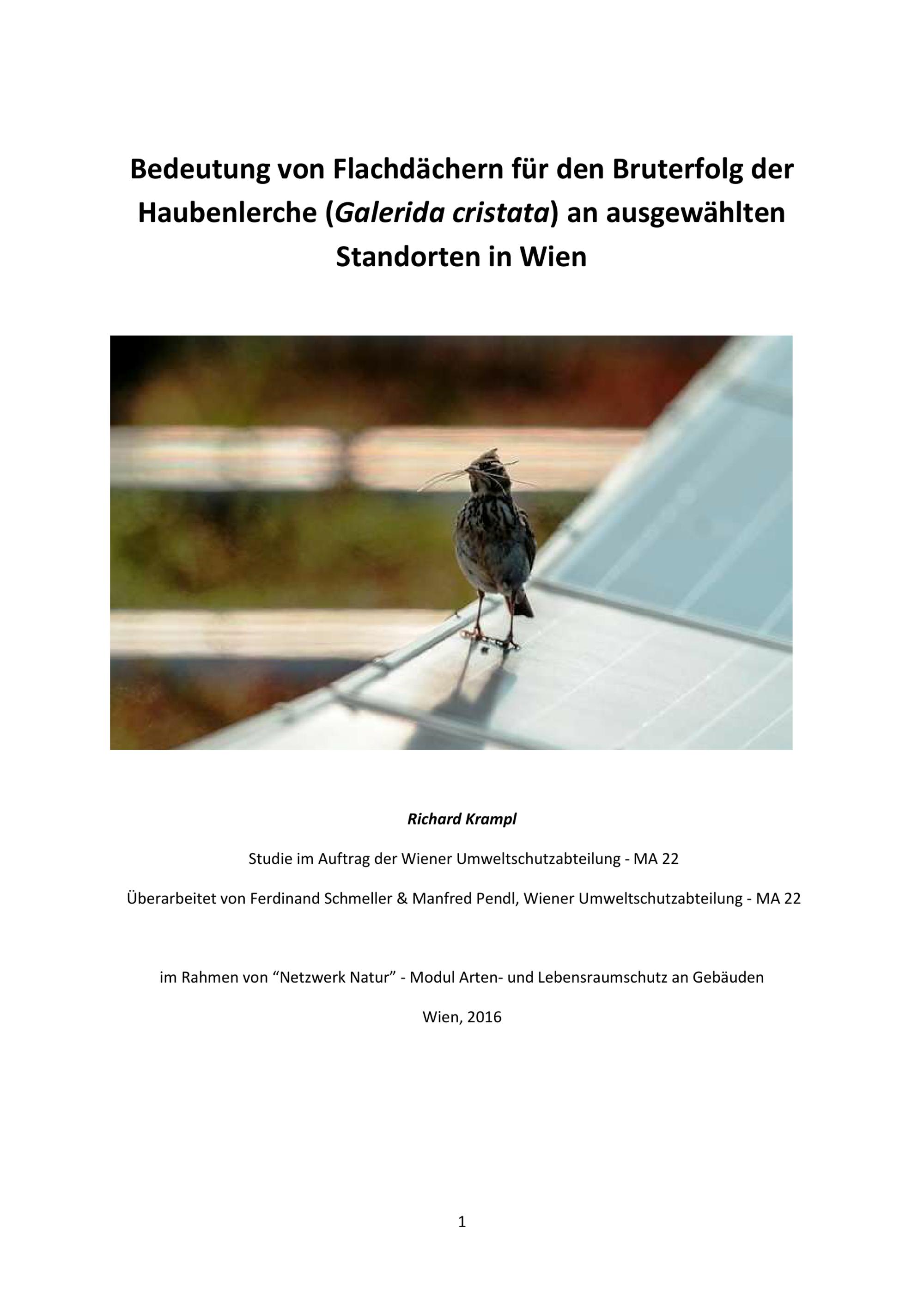 Bedeutung von Flachdächern für den Bruterfolg der Haubenlerche (Galerida cristata) an ausgewählten Standorten in Wien : im Rahmen von “Netzwerk Natur” - Modul Arten- und Lebensraumschutz an Gebäuden / Richard Krampl ; Studie im Auftrag der Wiener Umweltschutzabteilung - MA 22 ; überarbeitet von Ferdinand Schmeller & Manfred Pendl