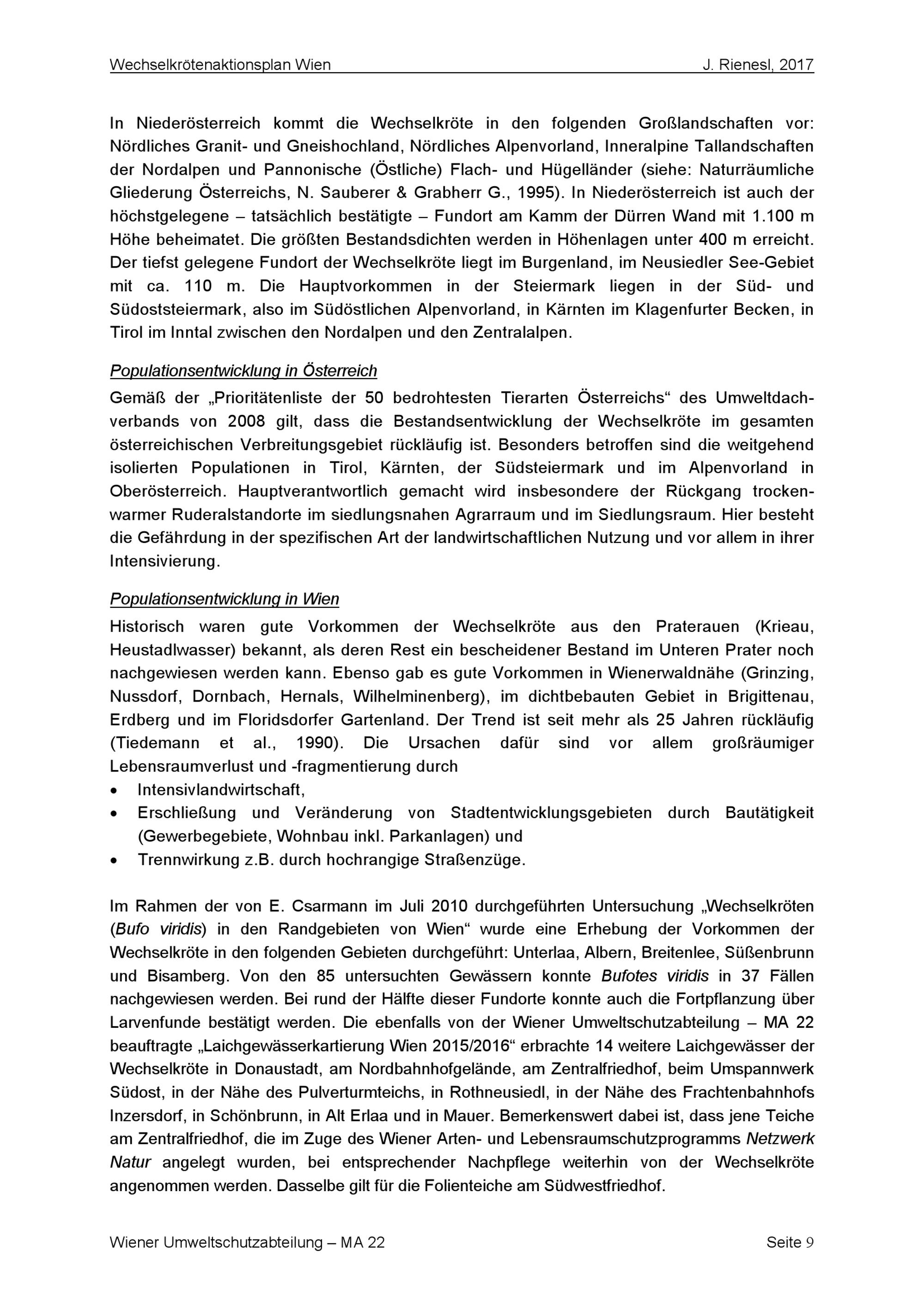 Wechselkrötenaktionsplan : Artenhilfsprogramm für die Wechselkröte in Wien / Medieninhaber und Herausgeber: Magistrat der Stadt Wien, Wiener Umweltschutzabteilung - MA 22 ; Autor: Dr. Jürgen Rienesl