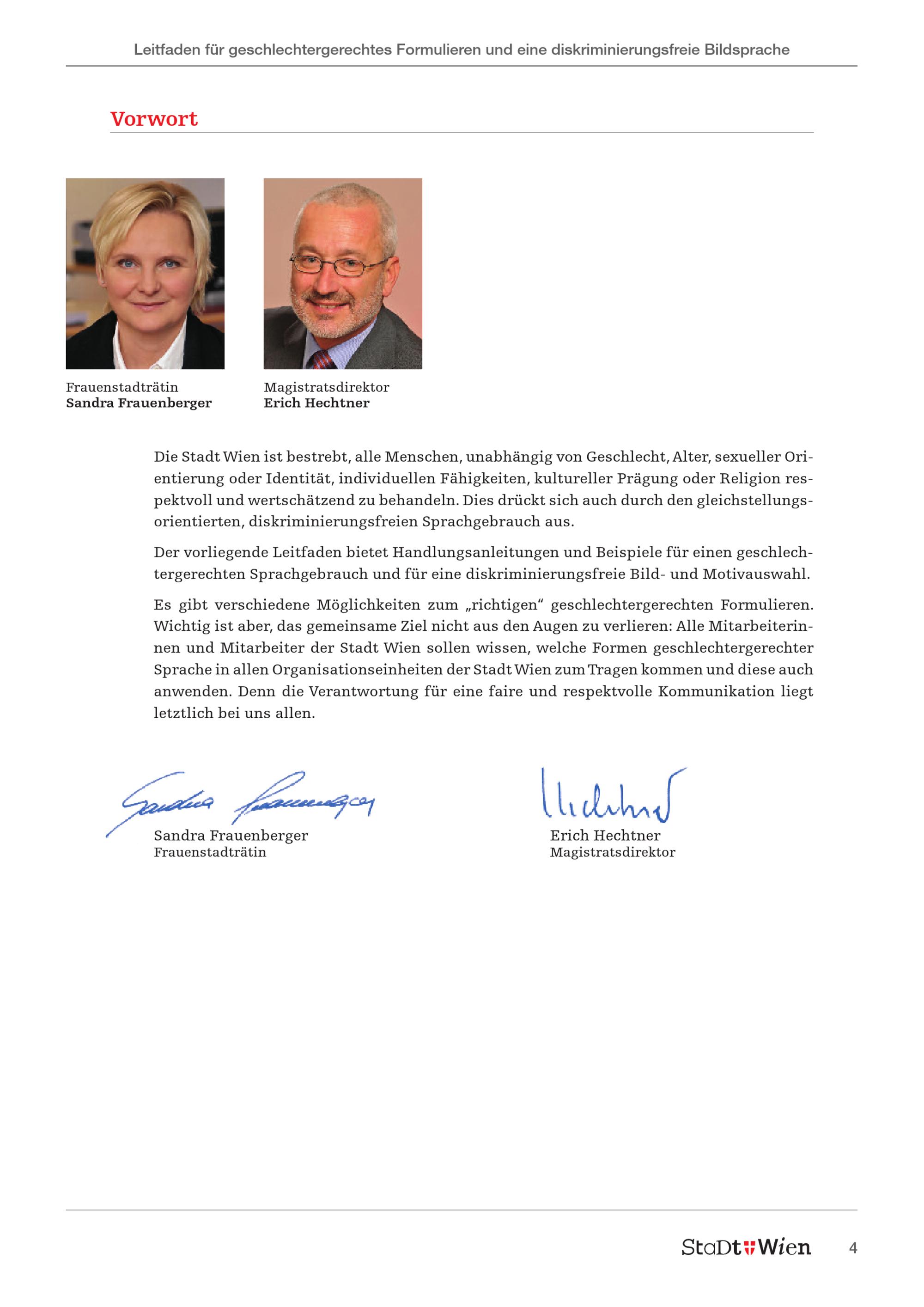 Leitfaden für geschlechtergerechtes Formulieren und eine diskriminierungsfreie Bildsprache / Eigentümerin und Herausgeberin: Magistratsdirektion - Geschäftsbereich Organisation und Sicherheit (MDOS), Dezernat Gender Mainstreaming, MA 53 - Presse und Informationsdienst ; Text: Daniela Cochlar [und 3 weitere]