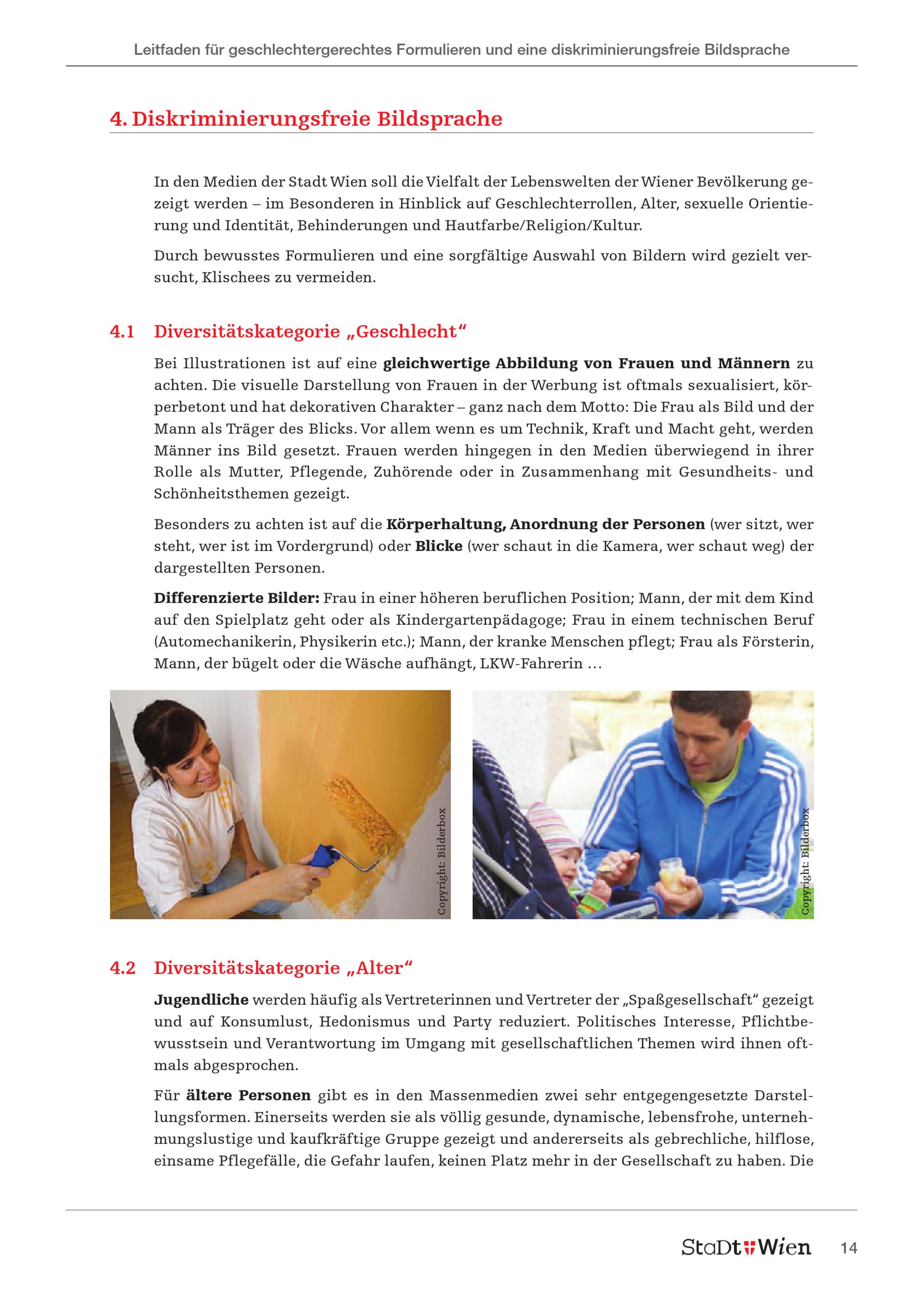 Leitfaden für geschlechtergerechtes Formulieren und eine diskriminierungsfreie Bildsprache / Eigentümerin und Herausgeberin: Magistratsdirektion - Geschäftsbereich Organisation und Sicherheit (MDOS), Dezernat Gender Mainstreaming, MA 53 - Presse und Informationsdienst ; Text: Daniela Cochlar [und 3 weitere]